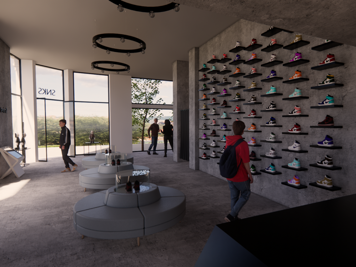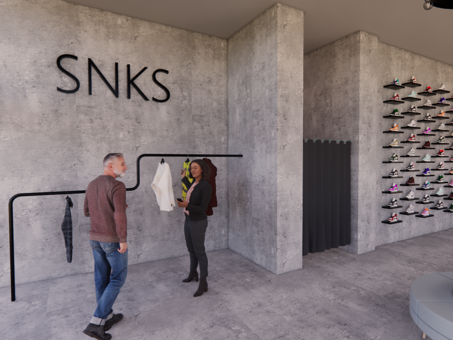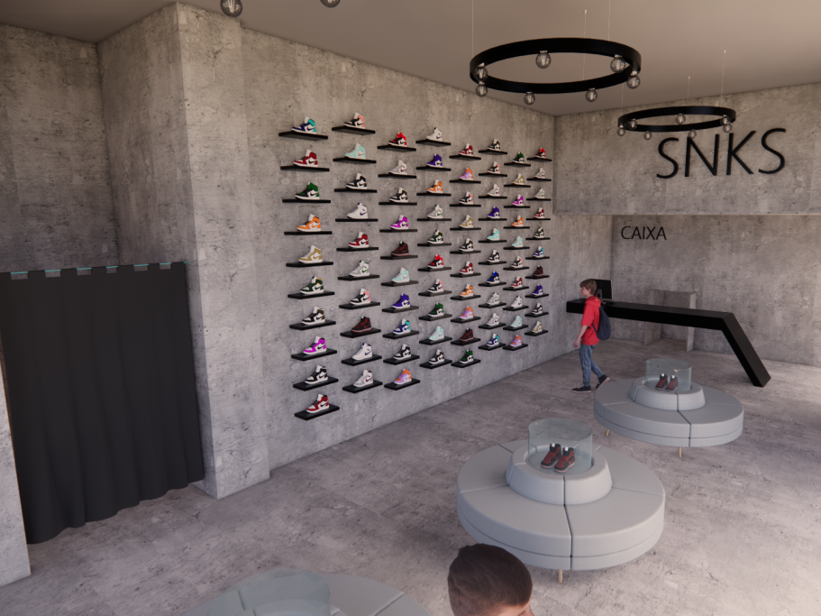 Lo que ves aquí no es una fotografía, es un proyecto 3D integral diseñado por el equipo de Disseny Gomis. Esta visualización hiperrealista nos permite anticipar cada detalle técnico y estético antes de que las obras comiencen: desde la textura del hormigón visto hasta la disposición exacta del sneaker wall y la iluminación estratégica de la ropa.