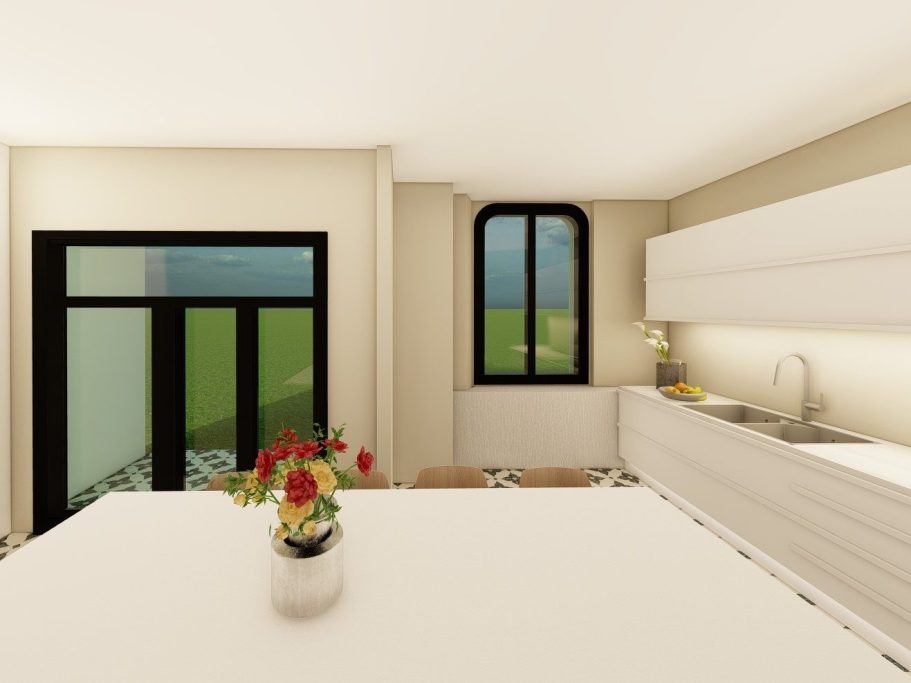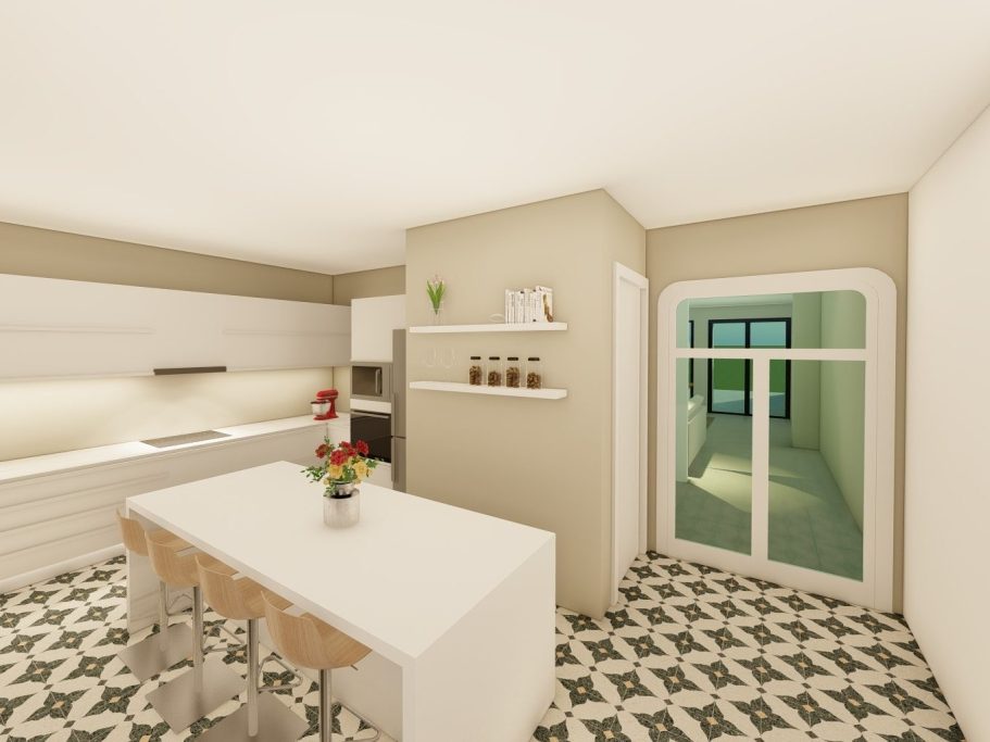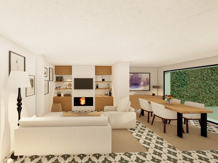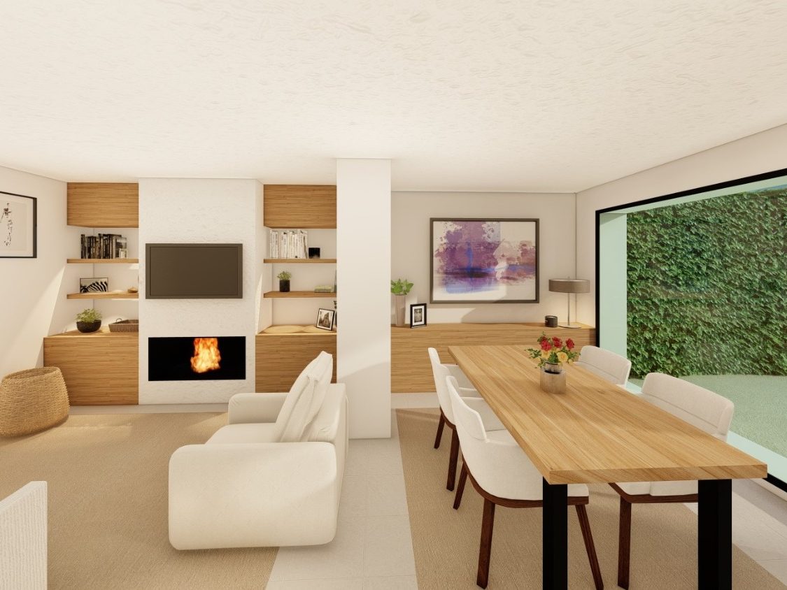 Visualización 3D de una vivienda unifamiliar en Vilassar de Dalt. Este proyecto busca combinar la tradición de la "casa de cos" catalana con una solución actual, incorporando mobiliario más minimalista y actual. Se han abierto grandes ventanales en la zona del jardín para iluminar toda la vivienda y potenciar la conexión con el exterior.