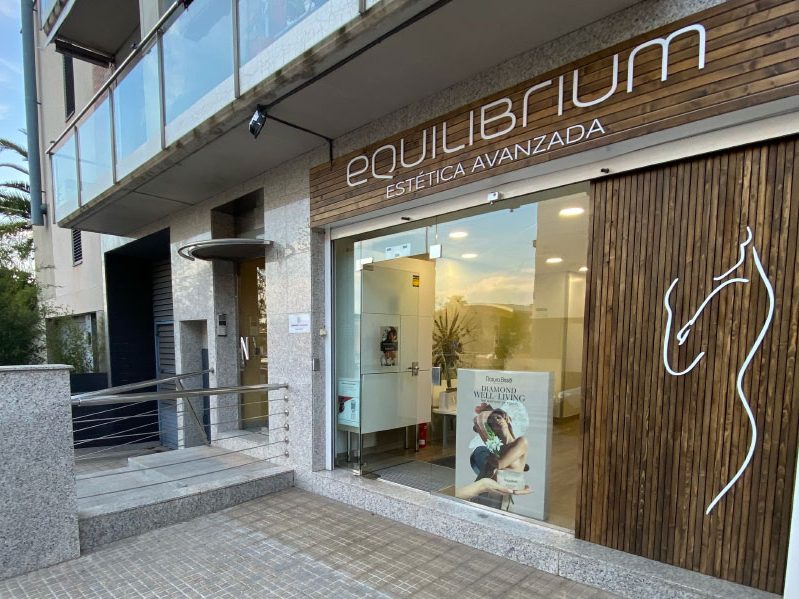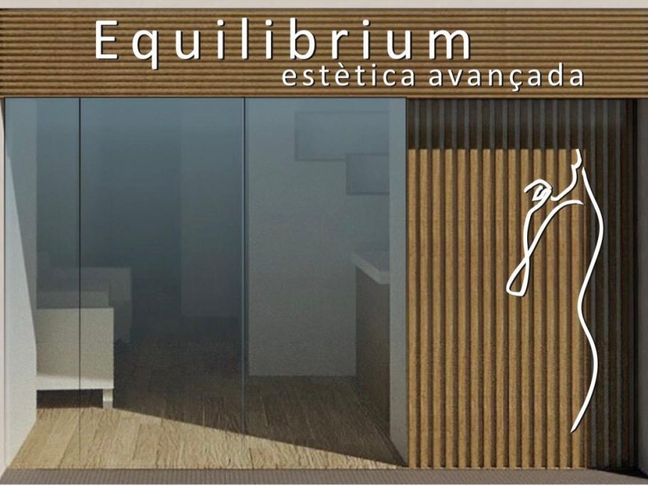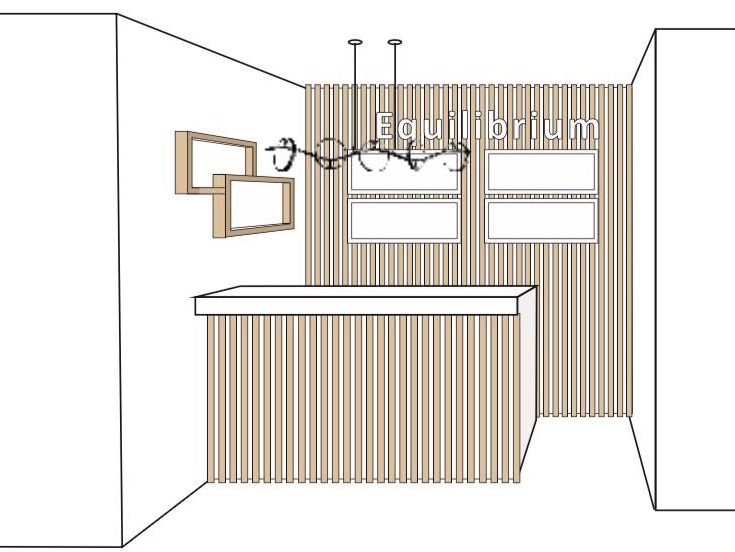 El interior combina blanco y madera teñida con estanterías con iluminación LED integrada y el logo "EQUILIBRIUM" situado detrás del mostrador como elemento central