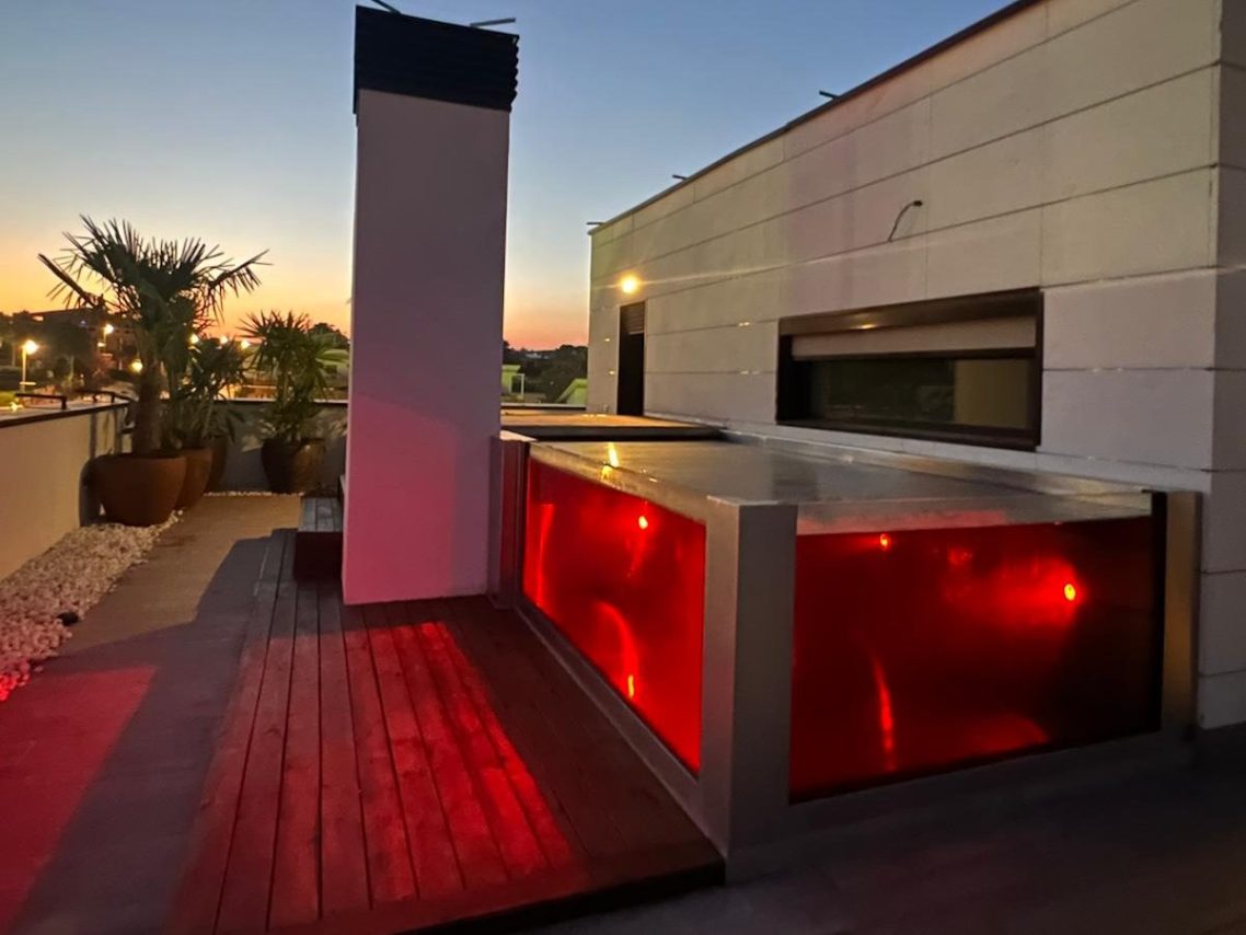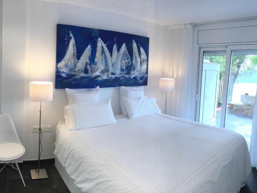 La planta superior alberga la suite principal, con acceso a una gran terraza privada equipada con piscina climatizada y pavimento de madera natural diseñado y ejecutado por Disseny Gomis, creando un espacio exterior íntimo y confortable. El uso de materiales naturales, junto con la conexión visual con el mar, refuerza la sensación de amplitud, luminosidad y armonía entre interior y exterior, ofreciendo una experiencia residencial elegante y envolvente.