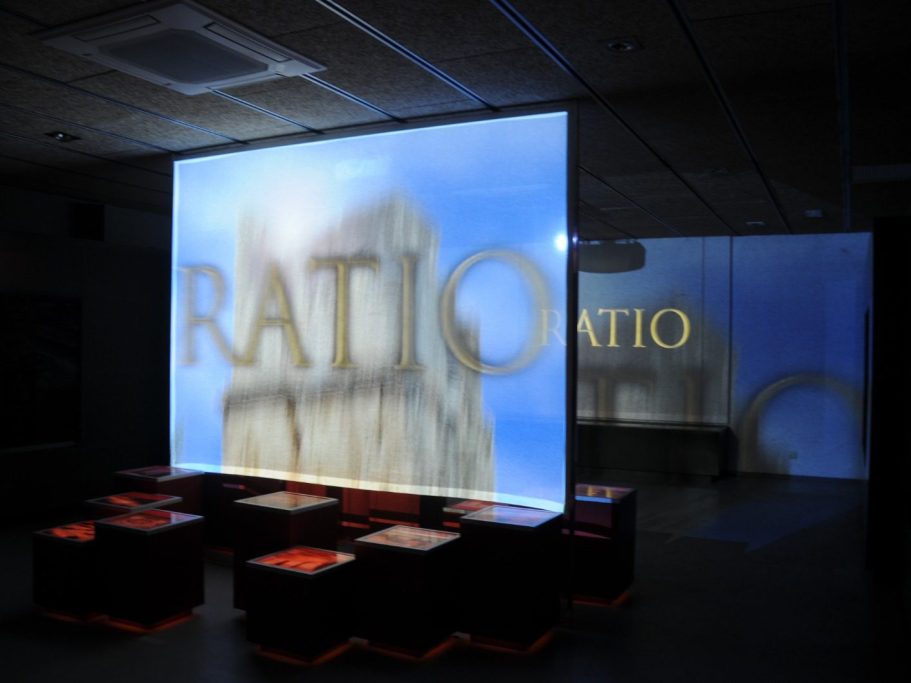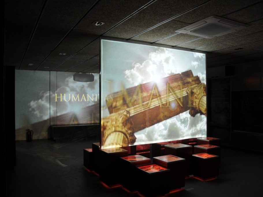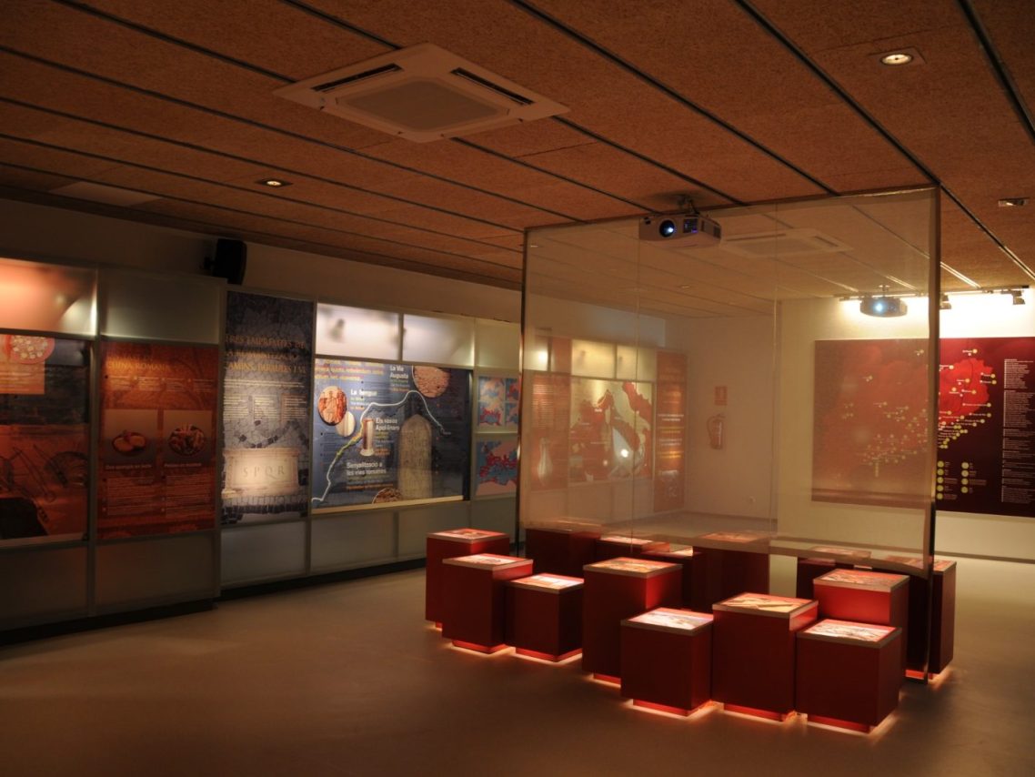 La exposición explica la producción del vino laietano en época romana mediante una doble proyección audiovisual: una en el fondo y otra en primer plano, creando un juego visual de superposición que ofrece una experiencia inmersiva.