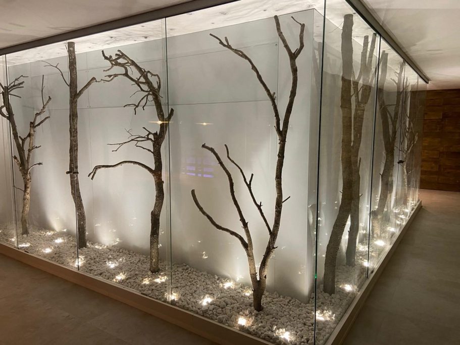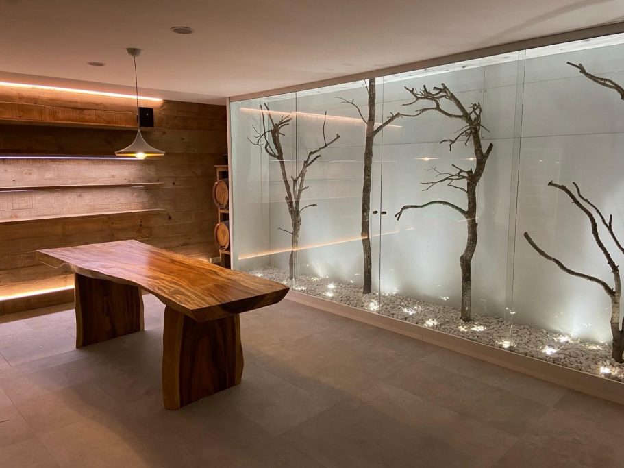 El principal reto fue incorporar elementos inexistentes en el interior, llevar la luz y la naturaleza al corazón de un sótano y convertir un espacio originalmente oscuro en un ambiente luminoso y acogedor mediante el uso de materiales naturales. Para ello se creó un perímetro acristalado en sus cuatro lados, acompañado de una cuidada iluminación artificial que baña robles y encinas del paisaje del Maresme.
