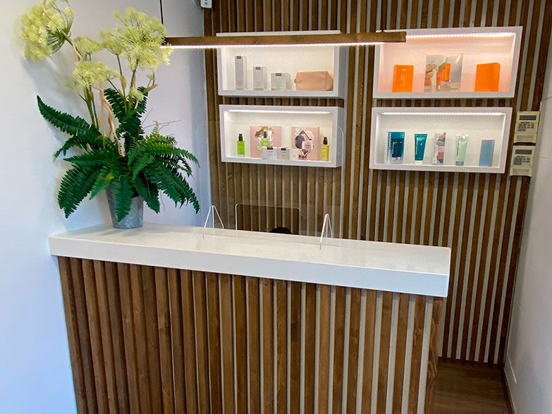 La identidad gráfica también forma parte del proyecto. El mensaje “Cuidamos de ti” se integra en el espacio como elemento comunicativo, junto con un logotipo diseñado específicamente e incorporado en todo el local.
