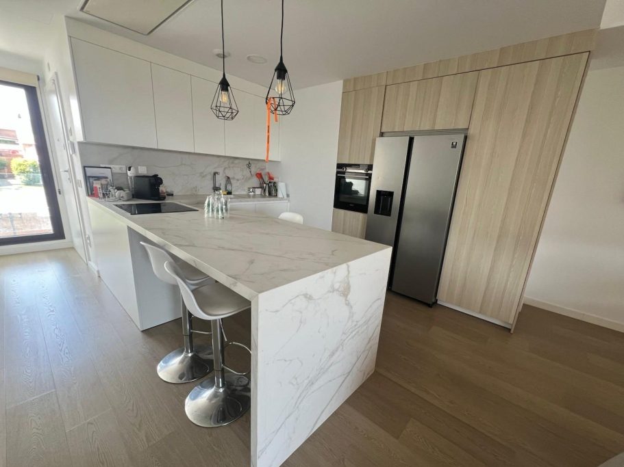 Situada en un edificio con vistas panorámicas al mar, esta vivienda unifamiliar se desarrolla en dos plantas. La planta baja ofrece un espacio diáfano que integra cocina, salón y comedor, conectado con una amplia terraza exterior que inunda el interior de luz natural y potencia la relación visual con el entorno.
