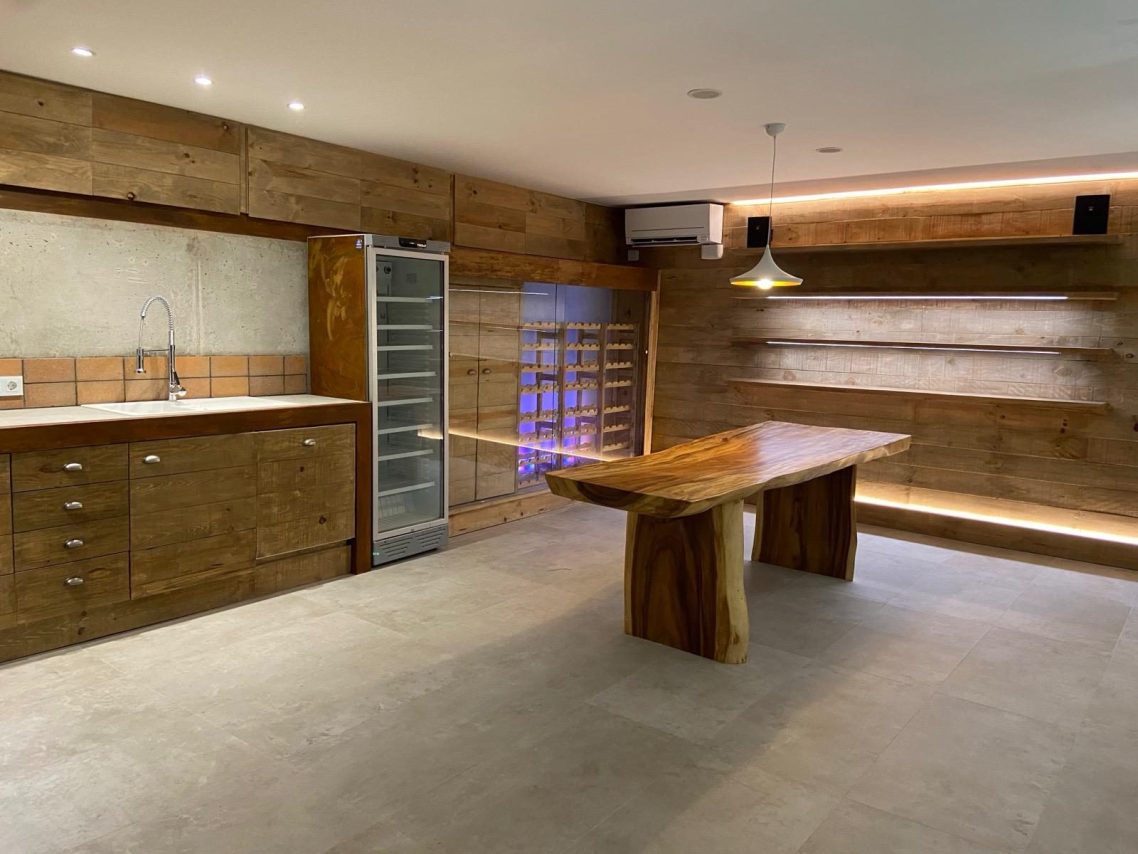 Sótano de una vivienda en Caldes d’Estrac. Se trata de un espacio sin vistas ni luz natural. El encargo del cliente consistía en transformar este nivel en un espacio lúdico, un lugar donde reunirse, cocinar con leña, comer y conservar una buena colección de vinos.